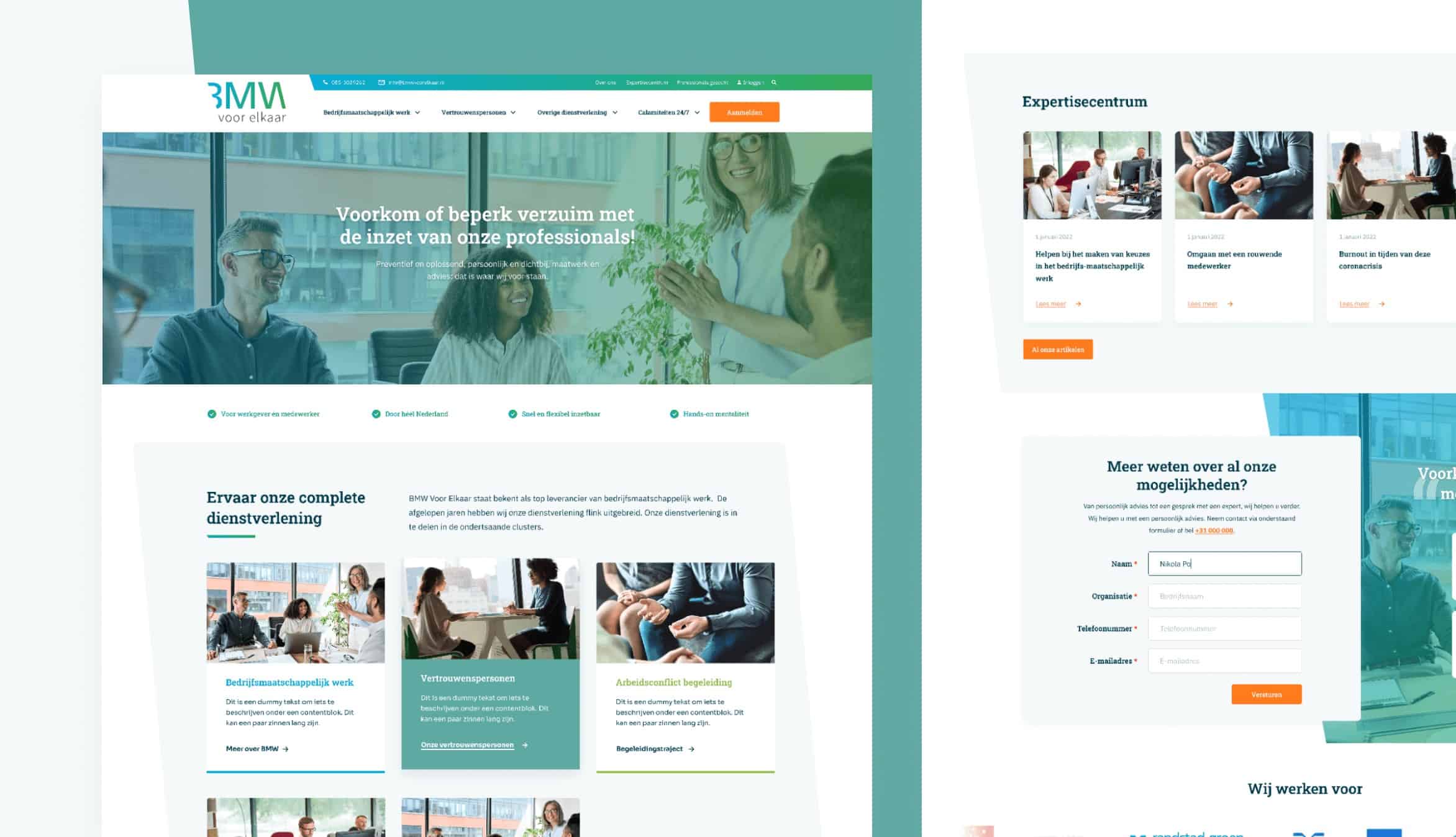 BMW Voor Elkaar is een groeiend landelijk netwerk van bedrijfsmaatschappelijk werkers, vertrouwenspersonen, calamiteitenbegeleiders, coaches, mediators, HR-specialisten en trainers. Met hun groot aantal professionals met verschillende specialiteiten helpen ze diverse organisaties.