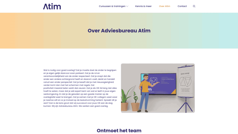 Adviesbureau Atim, een advies- en opleidingsbureau gespecialiseerd in het verhogen van de kwaliteit van het werk van ondernemingsraden en ambtelijk secretarissen, wilde een nieuwe website ontwikkelen die beter aansluit bij de behoeften van hun doelgroepen. Het doel? Vergroten van het vertrouwen bij potentiële cursisten klanten, het bieden van heldere informatie en het stimuleren van inschrijvingen. Samen met Adviesbureau Atim hebben we een website gerealiseerd die vertrouwen wekt, informatief is en eenvoudig in gebruik.