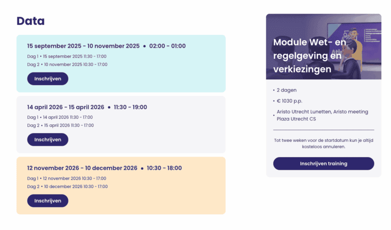 Bij elke cursus worden de inhoud, leerdoelen en praktische informatie helder en gedetailleerd beschreven. Dit geeft bezoekers een compleet beeld van wat ze kunnen verwachten en helpt hen een weloverwogen keuze te maken.