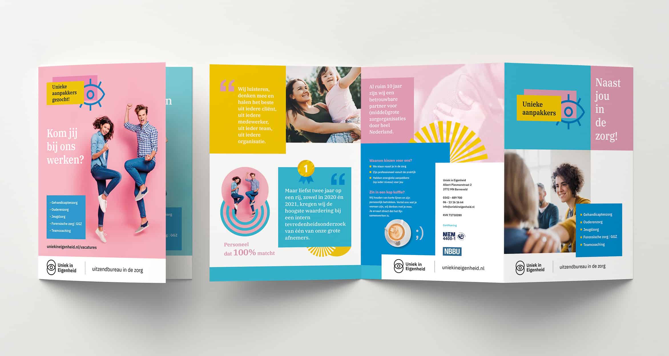Uniek in Eigenheid is een uitzendbureau voor zorgpersoneel. Welke zorg ook nodig is, zij hebben passende zorgmedewerkers met de juiste vaardigheden, kennis, betrokkenheid en energie! Die energie en eigenheid is terug te zien in de uitstraling van hun website, advertenties en drukwerk. Cherry heeft diverse vormgeving gemaakt voor drukwerk.