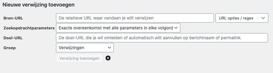 Na het aanklikken van de menu optie “Redirection” opent er een pagina waar onderin een kopje “Nieuwe verwijzing toevoegen” bij staat, hier kan een Redirect worden toegevoegd.