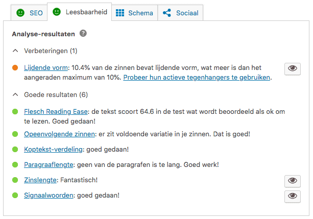 - SEO-analyse: hier zie je hoe goed je tekst is voor de vindbaarheid in Google. Dit wordt aangegeven door drie emojicons die rood, oranje of groen is met de bijbehorende emoties.
