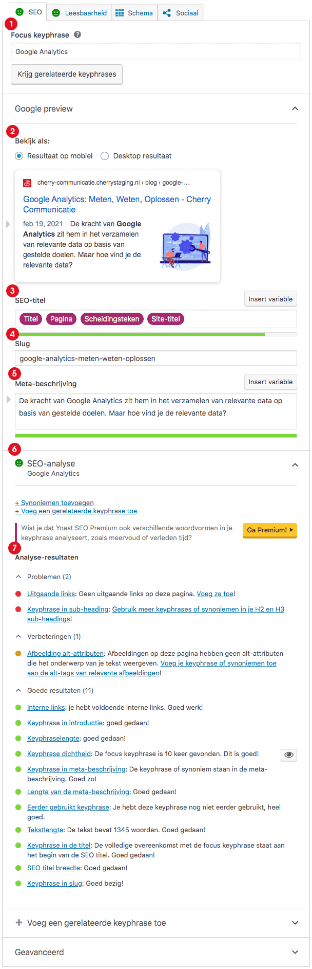 - Meta-beschrijving: dit is een korte beschrijving waar het artikel overgaat. Als de lengte goed is dan verschijnt er onder de tekst een groene balk. Als de tekst te kort is dan is de balk oranje en als de tekst te lang is dan is de balk rood.