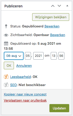 5. Publiceer op: zodra je een bericht publiceert dan wordt er een publiceer datum aangemaakt. Dit is handig om bij te houden wanneer je wat hebt geplaatst. Maar je kan ook een datum in de toekomst instellen. Zodra het die dag en tijd is wordt de pagina of het bericht gepubliceerd en kan de website bezoeker het artikel lezen. Op deze manier kan je bijvoorbeeld veel artikelen op één dag schrijven en inplannen om er bijvoorbeeld op elke maandag één te publiceren.