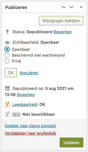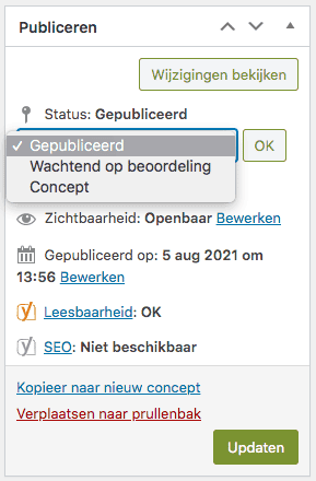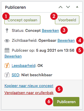 1. Concept opslaan: als je een bericht of pagina hebt geschreven en nog niet gepubliceerd, dan zie je de knop Concept opslaan staan. Hiermee sla je het artikel op zonder dat deze nog te zien is door je bezoekers. Als je artikel al gepubliceerd is dan staat deze knop er niet meer.