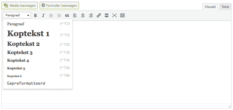 De WordPress tekst editor of ook wel de WYSIWYG editor (What You See Is What You Get) is het meest voorkomende veld wat je binnen WordPress zult gebruiken. Hierin schrijf je de meeste teksten die te lezen zijn op je website. En er zijn dan ook veel mogelijkheden met betrekking tot de opmaak van je teksten met deze editor. Hieronder staat een uitleg over het gebruik van de meest voorkomende opmaak mogelijkheden