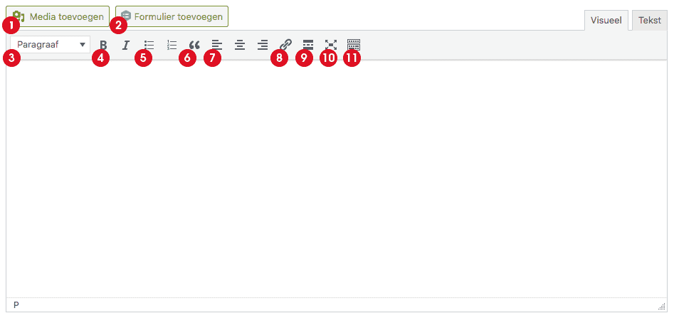 11. Toolbar weergeven/verbergen: toon of verbergt meer opties om je tekst te bewerken. Al deze onderliggende opties worden binnen ons thema niet ondersteunt.